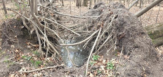 When these two trees fell, the hole that was created by their roots created an excellent wallow for hogs.