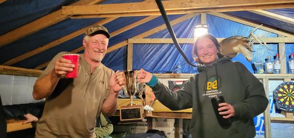 Jeff Moll who won last year's big buck contest for The Red Brush Gang, handing over the trophy to this year's winner, Selina Walters!